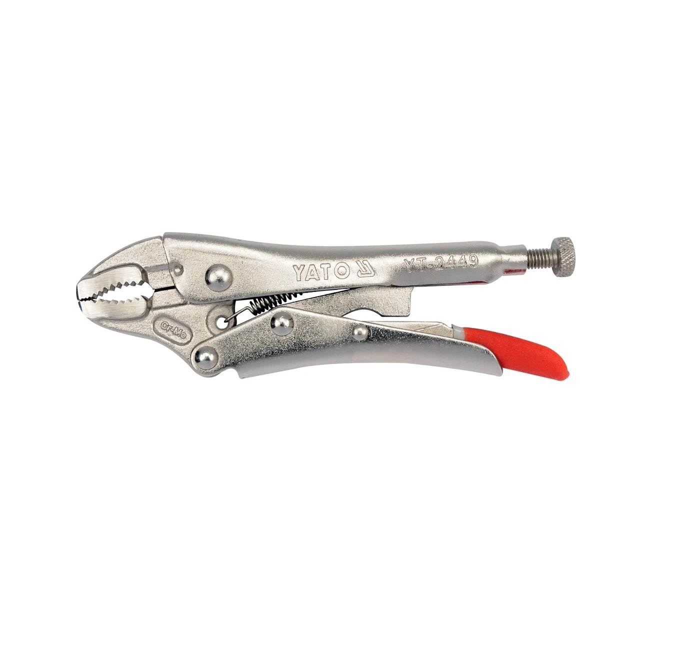 Зажим YT-2449 универсальный и пригодится для слесарных или монтажных работ, можно использовать для ремонта автомобиля или сварки. Благодаря зажиму получится быстро захватить предмет, гарантирована надежная фиксация усилия и полный контроль раствора зазубренных губок. Настройка происходит с помощью винта на одной из рукоятей, на другой «подвижной руке» предусмотрен рычаг сброса блокировки.
